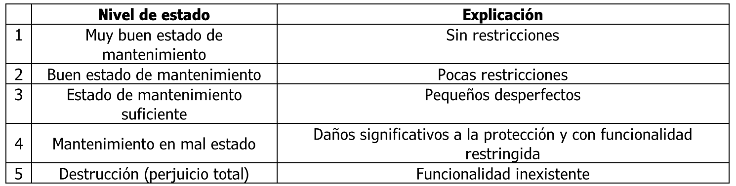 The structures should be organized by status levels, as cited in the following table. The lower the health level of a protective structure, the better its state of health.