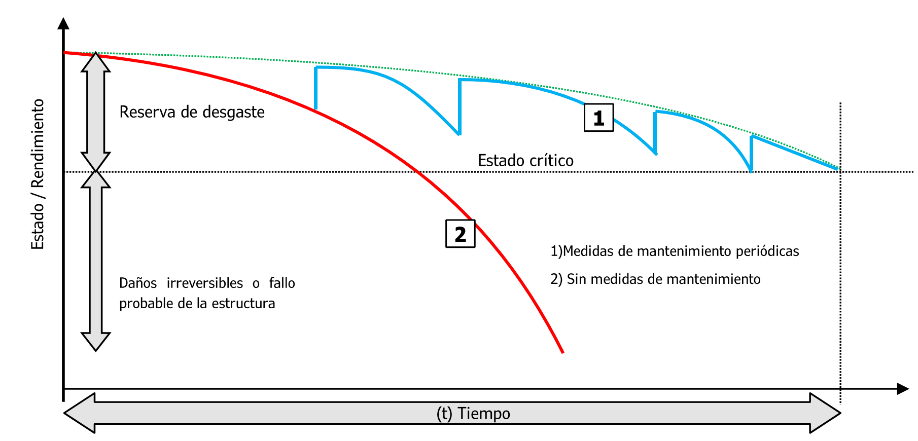 The measures are established when there is a danger of immediate loss of functionality or failure of the structure (wear reserve limit value exceeded). This strategy can lead to an irreversible loss of functionality. Neglected maintenance usually leads to the same result.